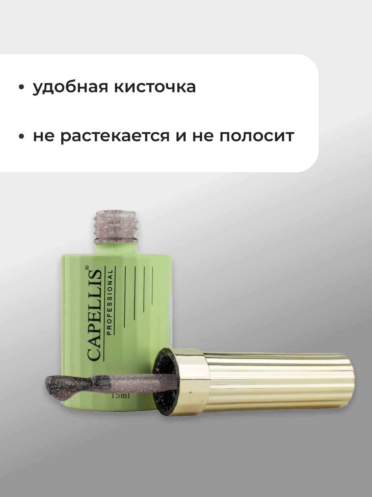 Гель-лак для ногтей Capellis с эффектом светоотражения. Его уникальная формула обеспечивает стойкое мерцание, которое переливается при любом освещении, делая ваш маникюр по-настоящему волшебным.