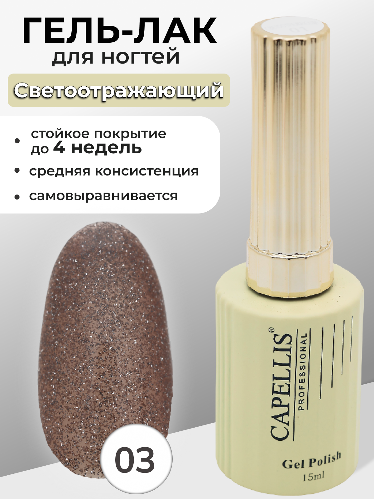 Светоотражающий гель-лак для ногтей Capellis с яркими и сияющими блестками, которые переливается при любом освещении, делая ваш маникюр по-настоящему волшебным. Для получения аккуратного результата рекомендуется наносить гель-лак тонким слоем, а для более яркого эффекта наносить на темную подложку.