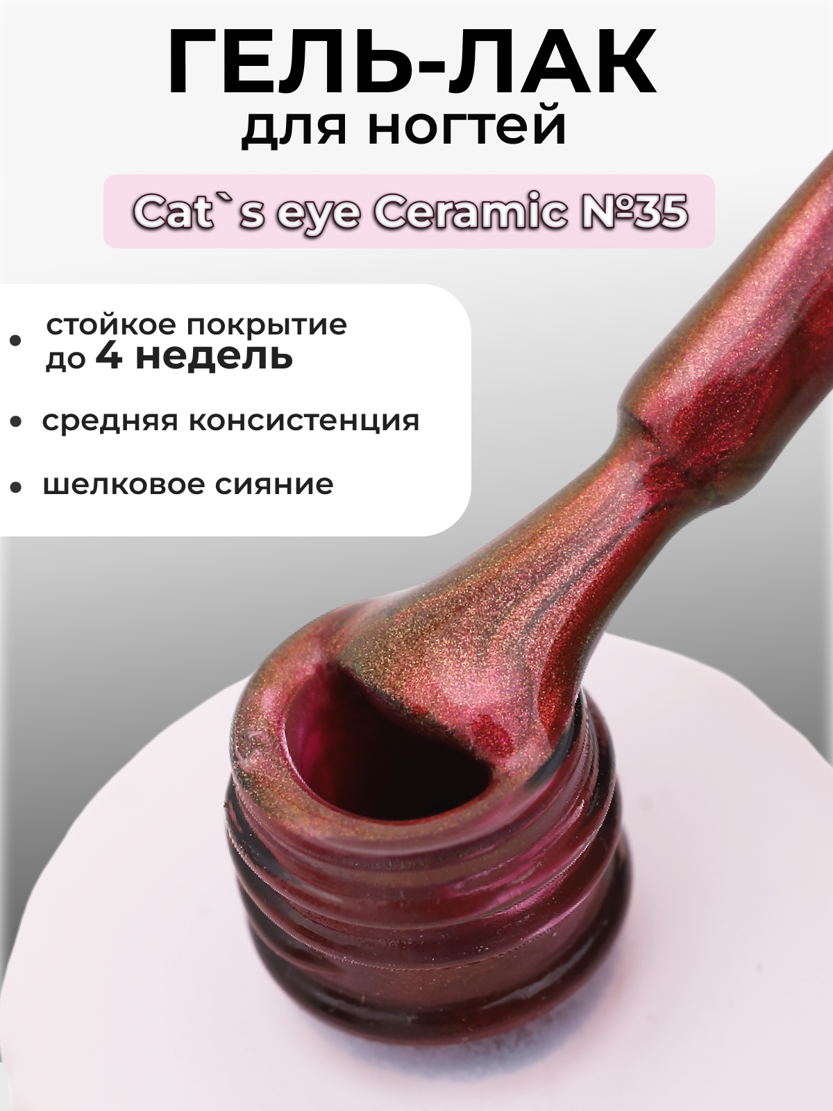 Шелковая кошка гель лак для ногтей Capellis Cat`s еye Ceramic - при нанесении на нюдовый гель, можно добиться нежного эффекта покрытия ногтей. При нанесении на чёрную подложку, цвет будет иметь более яркий эффект перелива мерцания. Гель-лак имеют микро шиммер, благодаря чему этот гель-лак смотрится очень нежно, как шелк.
