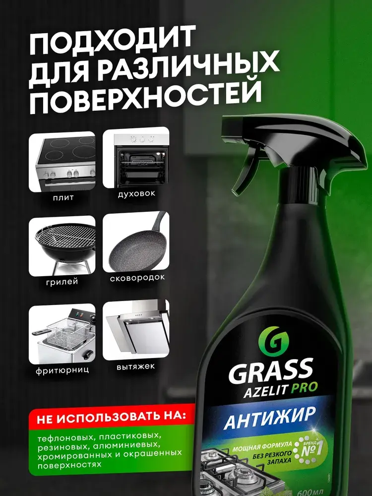 Высокоэффективное средство для очистки кухонных плит, грилей, духовых шкафов, фритюрниц, печей, посуды, вытяжных зонтов от стойких пищевых и органических загрязнений: нагаров, жира, копоти и пригоревшей пищи. Содержит активные чистящие компоненты, расщепляющие жир, нагар и др. органические загрязнения, действие которых гарантирует отличный результат без особых усилий. Удаляет неприятные запахи.
