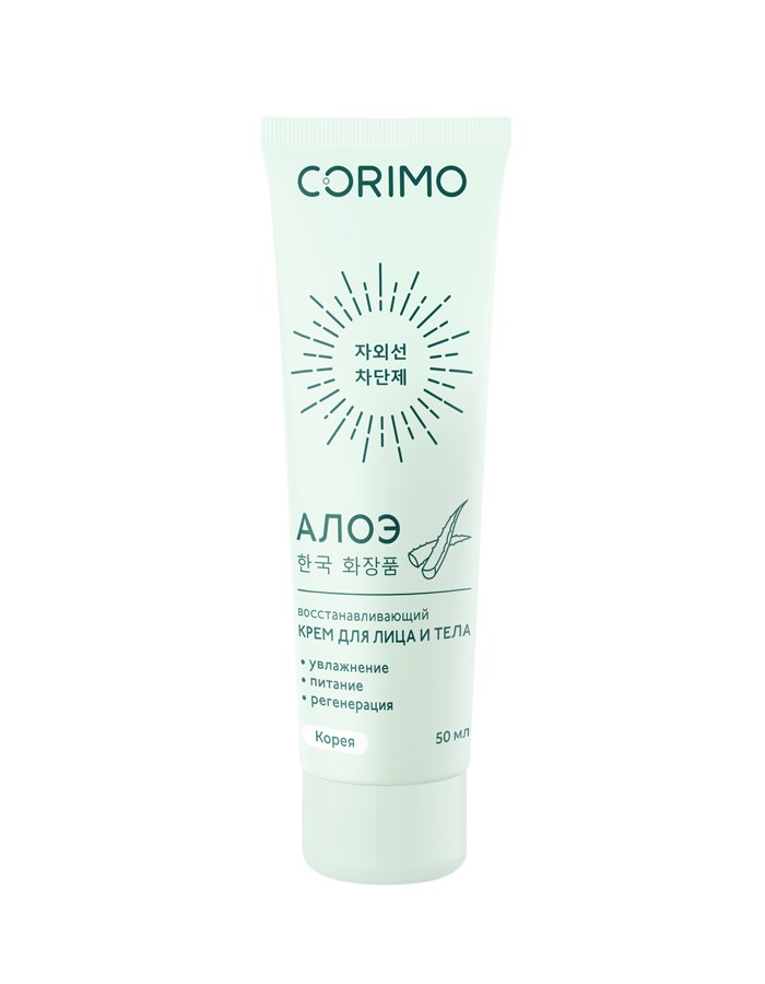 CORIMO Восстанавливающий крем для лица и тела АЛОЭ. Увлажняющая формула алоэ-крема с содержанием натуральных ингредиентов – это настоящее спасение для кожи, экстракт алоэ вера быстро и надолго восстанавливает необходимый уровень влаги в коже, полноценно насыщает клетки всеми необходимыми веществами, способствует образованию коллагена и эластина, препятствует потере упругости и появлению морщинок, делает кожу мягкой и шелковистой. Экстракт азиатской камелии богато антиоксидантами, витаминами А, В, С и Е, мононенасыщенными жирными кислотами и минеральными веществами. Кроме того, оно содержит коэнзим Q10, столь необходимый для эффективной борьбы со старением.