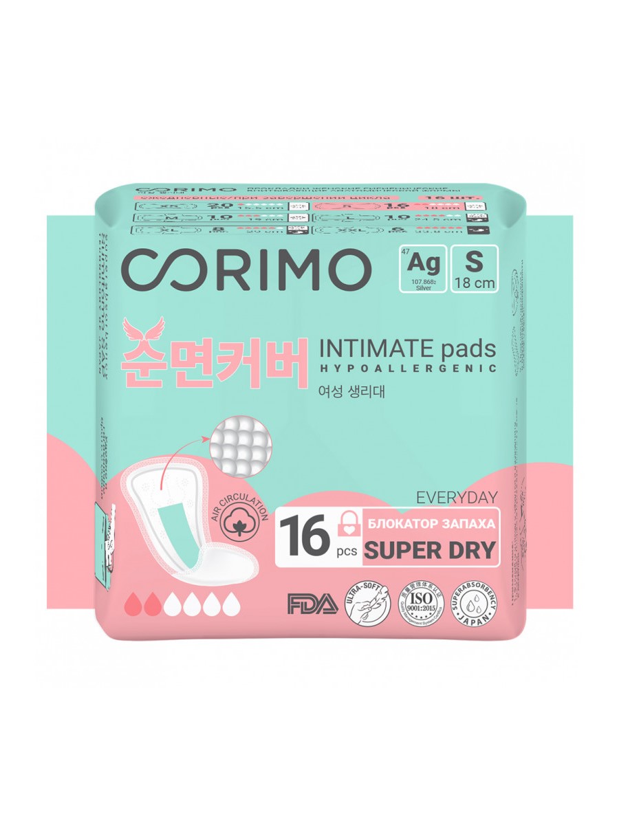 Технологичные и безопасные гигиенические женские прокладки с фигурными крылышками CORIMO разработаны совместно с лабораторией в Южной Корее. Прокладки обладают бактериостатическими свойствами, гипоаллергенны. Материалы прокладки не вызывают раздражений, высыпаний. Ультрамягкий верхних слой из нетканого материала без химических пропиток с отверстиями в виде воронки быстро пропускает жидкость внутрь прокладки и блокирует ее внутри. Японский суперабсорбент превращает жидкость в гель и впитывает в 30 раз больше своего веса. Нижний слой имеет микропоры, пропускающие воздух, но не жидкость. Клей для фиксации прокладки – 1 из компонентов жевательной резинки – для лучшей циркуляции воздуха нанесен тремя тонкими линиями, а не сплошной широкой полосой. Такая конструкция исключает образование парникового эффекта, а значит и опрелостей и покраснений на коже. Анионовый чип с наносеребром и экстрактом тиса, он препятствует размножению бактерий, возникновению запаха и гинекологических заболеваний. *Данный бренд имеет особенность производственного происхождения как в Китае ,Турции ,так и в Корее в связи с несколькими заводами-изготовителями в этих странах.
