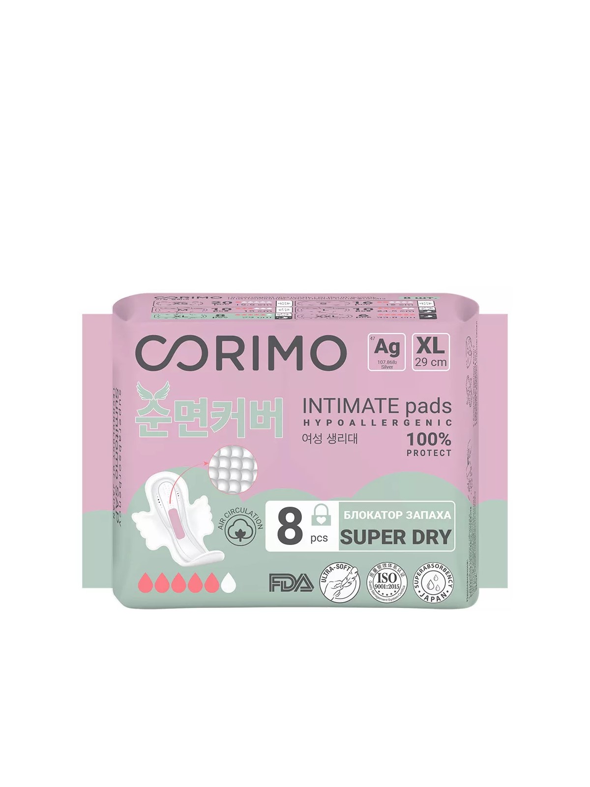 Технологичные и безопасные гигиенические женские прокладки с фигурными крылышками CORIMO разработаны совместно с лабораторией в Южной Корее. Прокладки обладают бактериостатическими свойствами, гипоаллергенны. Материалы прокладки не вызывают раздражений, высыпаний. Ультрамягкий верхних слой из нетканого материала без химических пропиток с отверстиями в виде воронки быстро пропускает жидкость внутрь прокладки и блокирует ее внутри. Японский суперабсорбент превращает жидкость в гель и впитывает в 30 раз больше своего веса. Нижний слой имеет микропоры, пропускающие воздух, но не жидкость. Клей для фиксации прокладки – 1 из компонентов жевательной резинки – для лучшей циркуляции воздуха нанесен тремя тонкими линиями, а не сплошной широкой полосой. Такая конструкция исключает образование парникового эффекта, а значит и опрелостей и покраснений на коже. Анионовый чип с наносеребром и экстрактом тиса, он препятствует размножению бактерий, возникновению запаха и гинекологических заболеваний. *Данный бренд имеет особенность производственного происхождения как в Китае ,Турции ,так и в Корее в связи с несколькими заводами-изготовителями в этих странах.