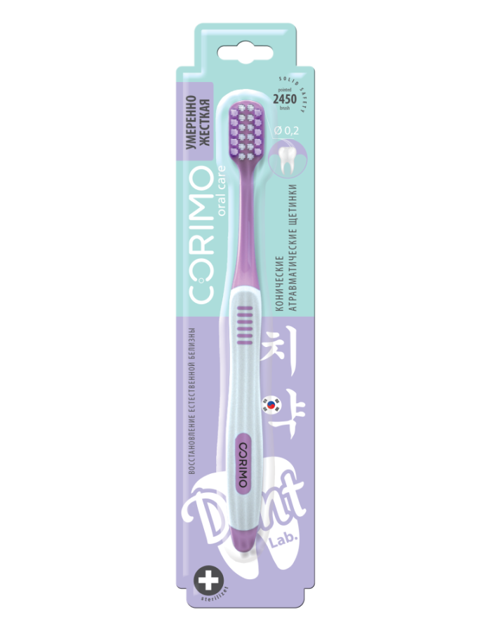 Зубная щетка Corimo умеренно жесткая: белизна зубов и комфорт в использовании Зубная щетка Corimo обеспечивает атравматическое удаление сложного налета от кофе, чая и табака благодаря плотному и узкому расположению пучков. Густая щетина щетки полирует эмаль, предотвращая образование зубного камня. Конические щетинки, созданные по технологии Pointed brush, легко проникают в самые узкие промежутки между зубами, тщательно и бережно вычищая их. Подходит для людей с повышенной чувствительностью зубов и кровоточивостью десен благодаря своей не травмирующей щетине. Выбирайте зубную щетку Corimo для белизны зубов и комфорта в использовании! Цвета в ассортименте. *Данный бренд имеет особенность производственного происхождения как в Китае ,Турции ,так и в Корее в связи с несколькими заводами-изготовителями в этих странах.