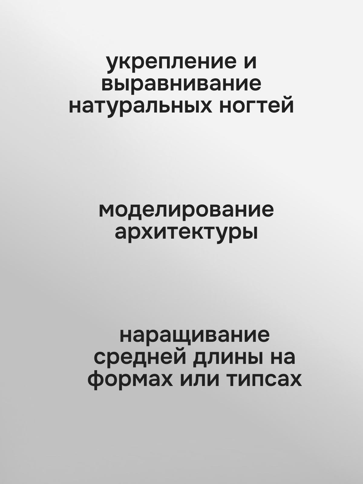 Builder gel помогает скрыть недостатки и дефекты ногтевой пластины, придавая им здоровый и естественный вид, а также подготовить к покрытию гель-лаком.