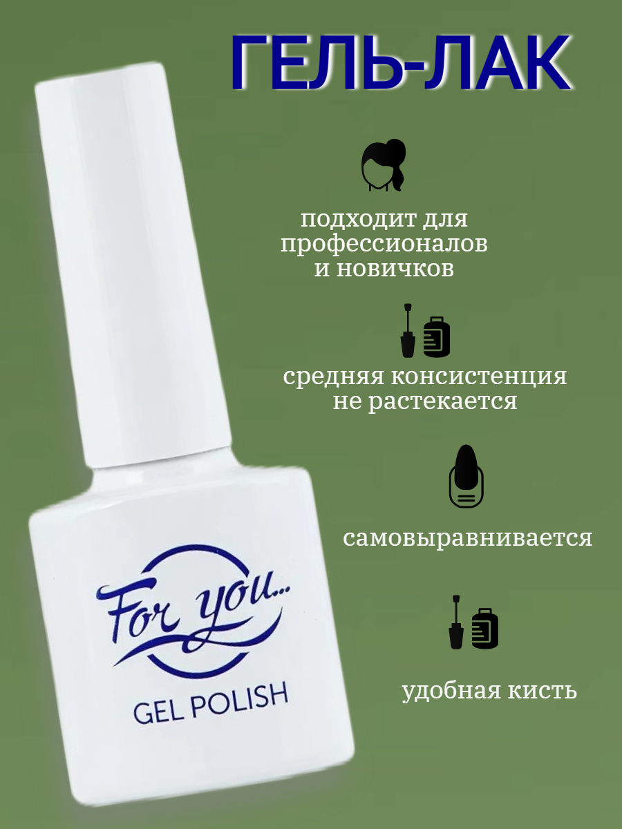 Гель-лак FOR YOU отличается густой консистенцией, высокой пигментированностью, не желтит, не полосит, не пузырится. Даёт отличный результат даже при нанесении в один слой, благодаря густой консистенции и удобной кисточке, которая позволяет прокрашивать цвет максимально близко к кутикуле.