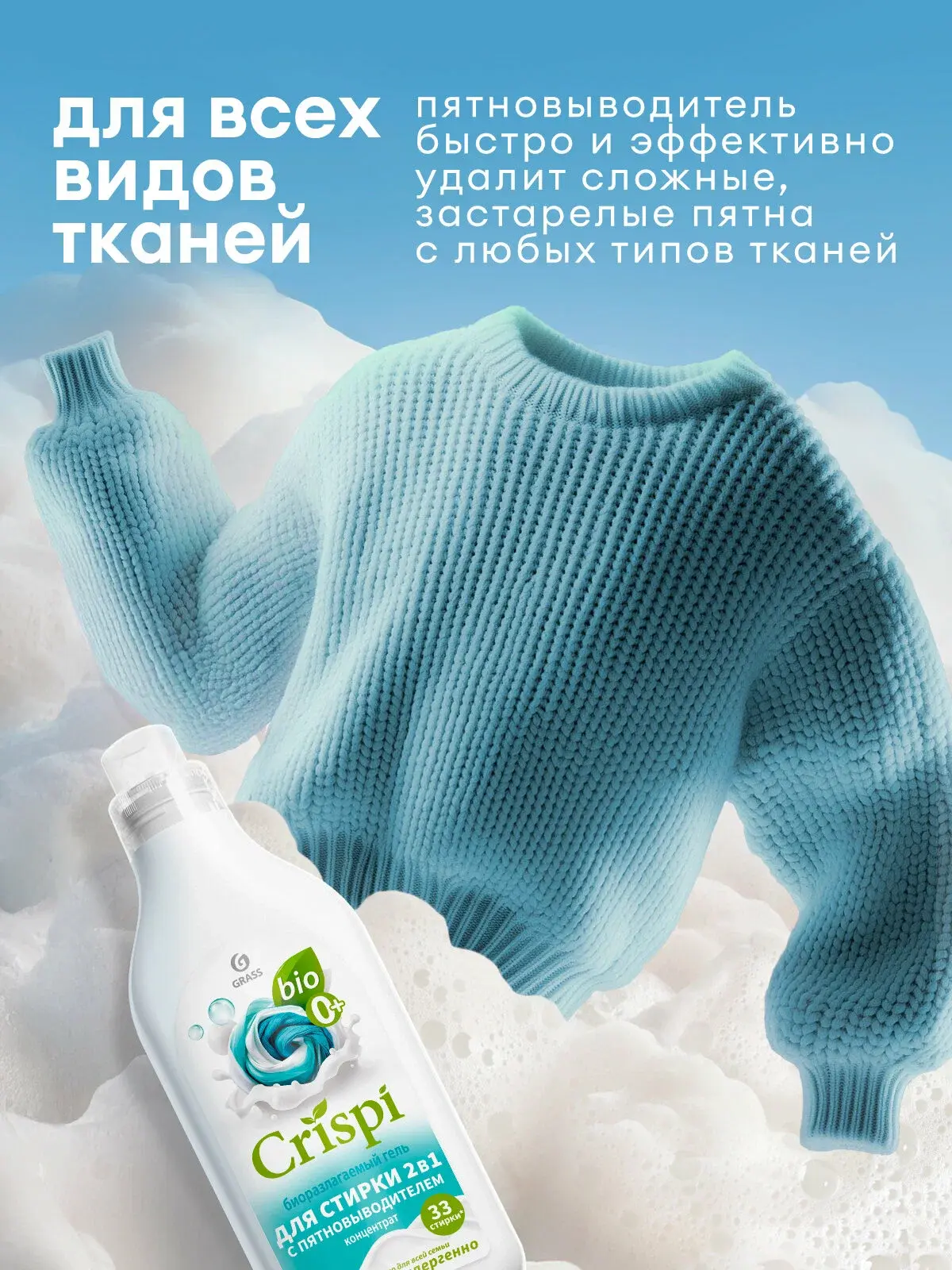 Концентрированный гель для стирки 2 в 1 с пятновыводителем, эффективно удаляет пятна.