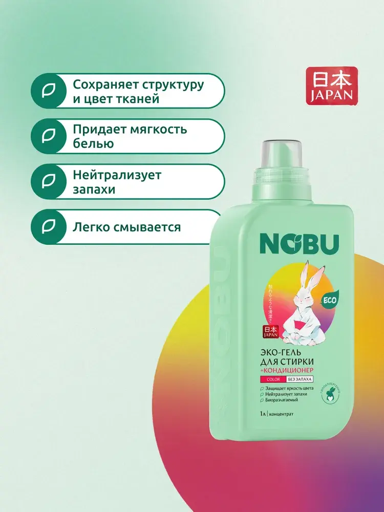 Эко-гель для стирки NOBU с кондиционером на 97% состоит из натуральных ингредиентов, глубоко очищает волокна и делает ткани мягкими.