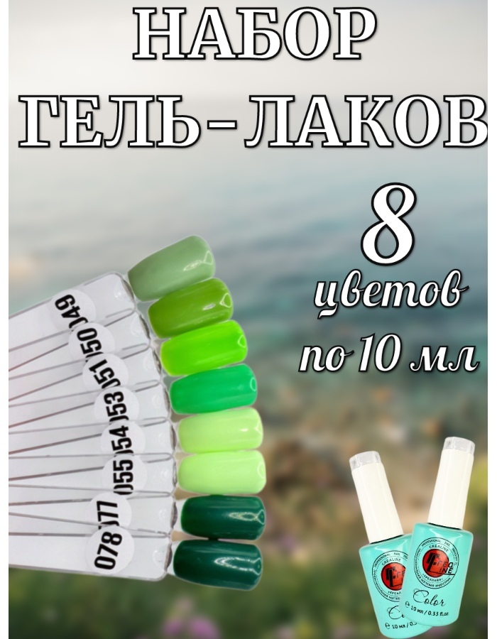 Создайте идеальный маникюр с нашим набором гель-лаков "Оттенки зеленого"! Этот комплект включает 8 высококачественных оттенков, идеально подходящих для выполнения стильного и элегантного френча.