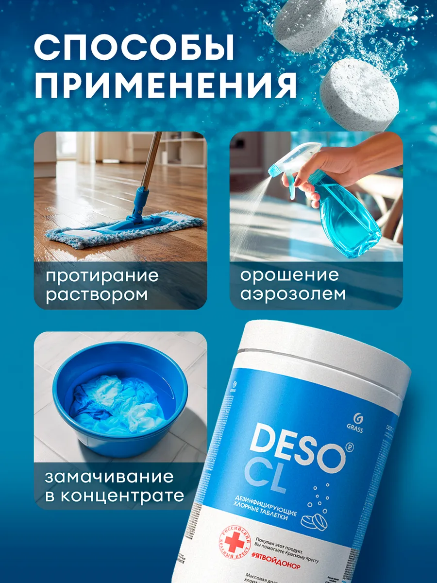 Средство дезинфицирующее с моющим эффектом Deso CL таблетки. Таблетки белого цвета с характерным запахом хлора, массой 3,3 г. для обеззараживания поверхностей в помещениях, жесткой мебели, санитарно-технического оборудования, систем мусороудаления, наружных поверхностей приборов и аппаратов, посуды, предметов для мытья посуды, ухода за больными, перевязочных материалов, средств личной гигиены, белья, уборочного инвентаря, крови, ликвора, выделений, смывных жидкостей, остатков пищи, уборочного инвентаря.