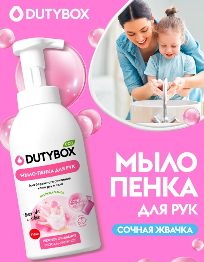 Жидкое мыло для рук и тела DUTYBOX с ароматом Bubble gum 500мл - увлажняющее мыло-пенка для ежедневного ухода за кожей, которое обеспечивает деликатный уход, не вызывая сухости и раздражения, подходит для использования с первых дней жизни, 0+. Благодаря входящим в состав смягчающим компонентам сохраняет защитные функции кожи. Яркий аромат сочной жвачки не оставит никого равнодушным. Специальный пенный дозатор обеспечивает экономичный расход. Гипоаллергенное мыло удаляет бактерии, успешно смывая их с поверхности кожи вместе с другими ежедневными загрязнениями. Бережный нейтральный Ph состав 5,5 с натуральными маслами подходит для использования в качестве геля для душа, который избавит от неприятных запахов и будет оставаться на коже длительное время. Туалетное детское мыло не вызывыет аллергии, подходит как для взрослых, так и для детей – его можно использовать в качестве пены для ванны.
