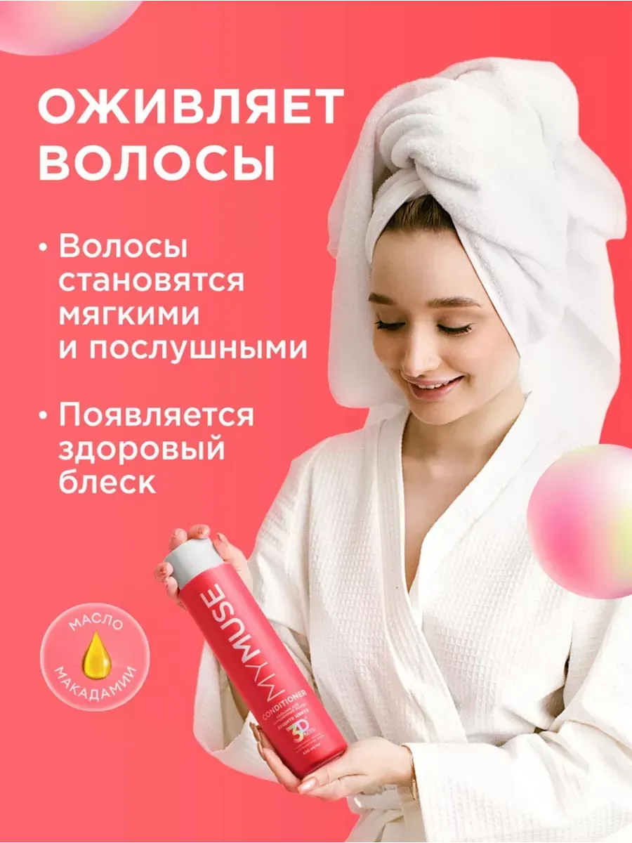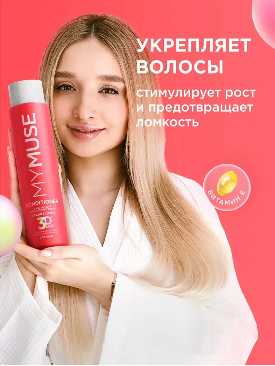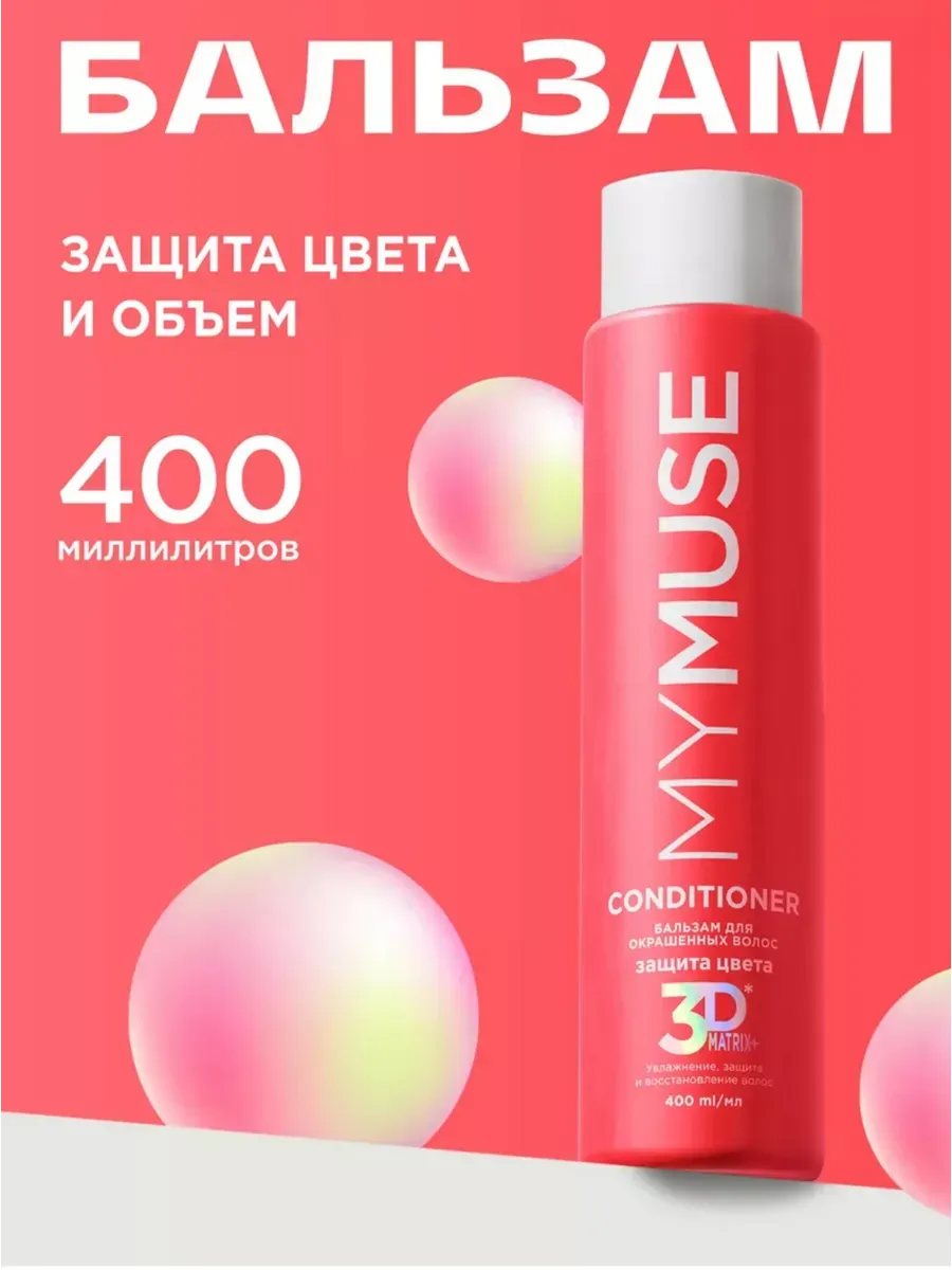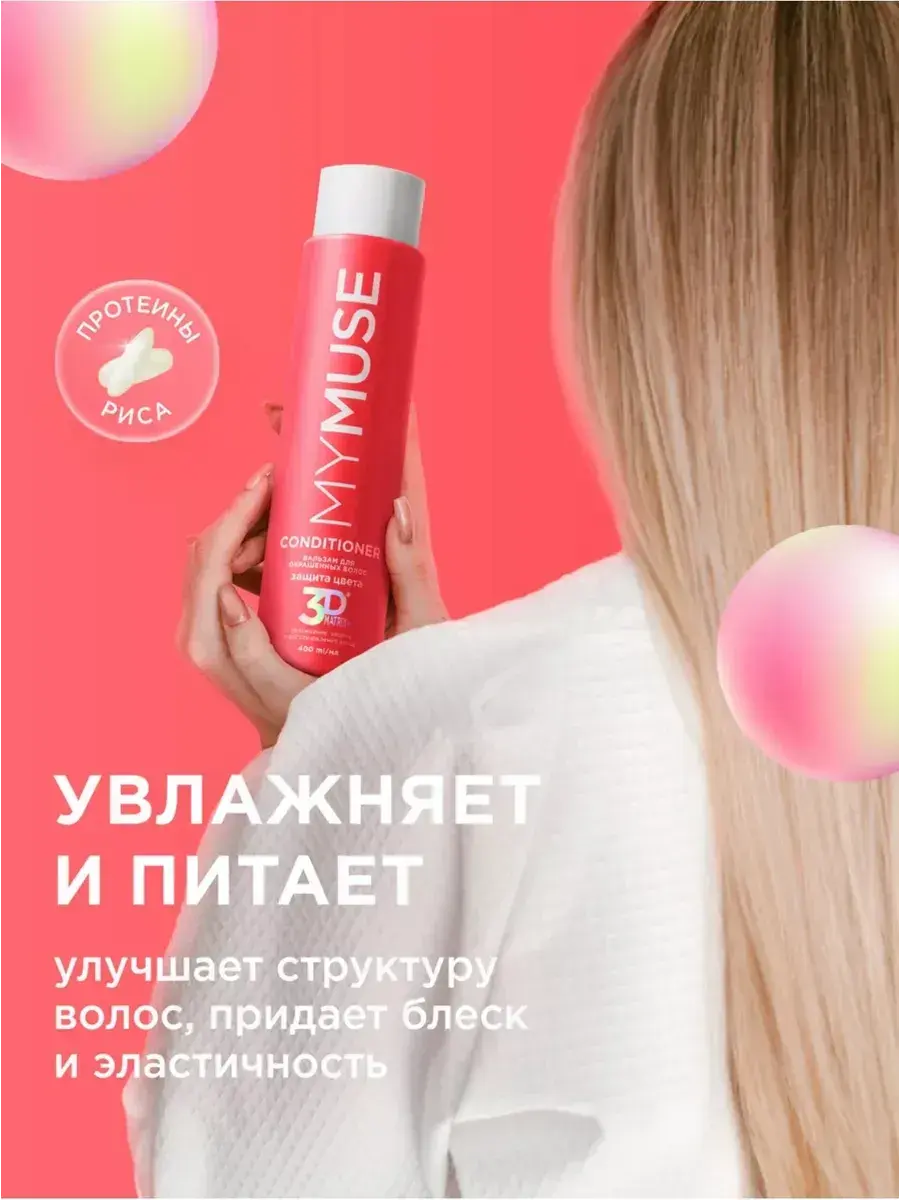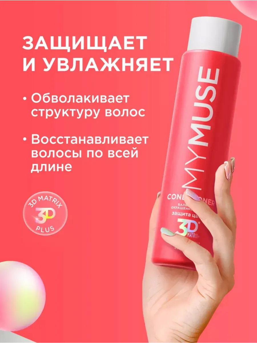 MY MUSE кондиционер для волос “Защита цвета и увлажнение” - это эффективное средство по уходу за всеми типами волос, в том числе склонными к выпадению. Кондиционер придает мягкость и живой блеск, облегчает расчесывание, делая волосы эластичными, мягкими и увлажненными. Бальзам для волос профессиональный интенсивно питает и придает здоровый блеск волосам, делая их гладкими и ухоженными. Бальзам ополаскиватель для волос легко смывается по всей длине, не утяжеляя структуру волос. Регулярное использование увлажняющего бальзама для волос защищает волосы от негативного воздействия внешней среды, средств для укладки и фена, облегчает расчесывание.