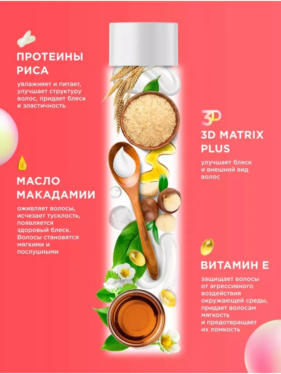 Защита цвета и увлажнение с технологией 3D Matrix Plus обволакивает, увлажняет, защищает и восстанавливает волосы по всей длине, благодаря активным натуральным компонентам из протеинов сои и семян рожкового дерева. Протеины риса питают волосы микроэлементами и насыщают их влагой по всей структуре волоса. Образуют защитную пленку, препятствуют вымыванию цвета.