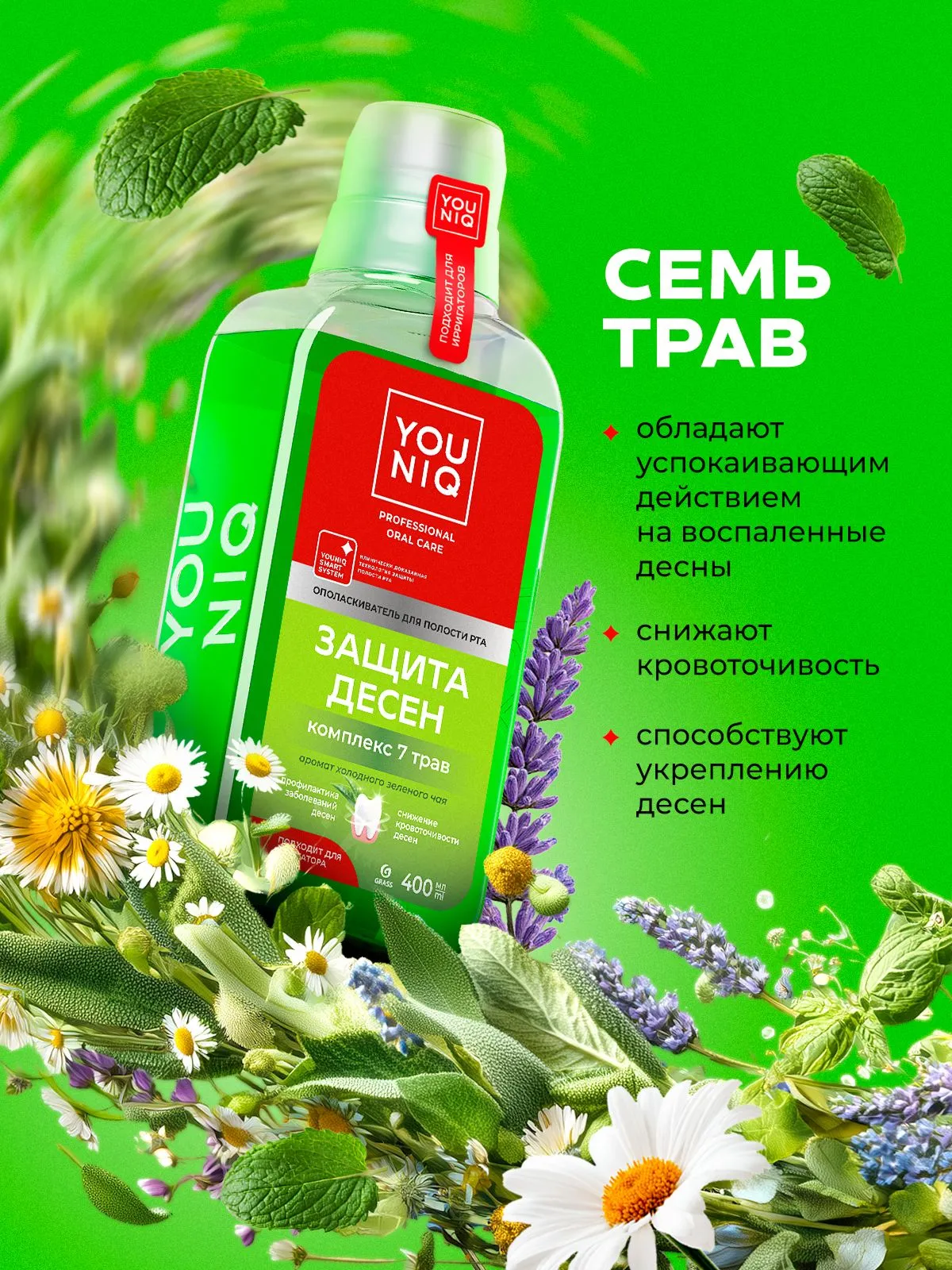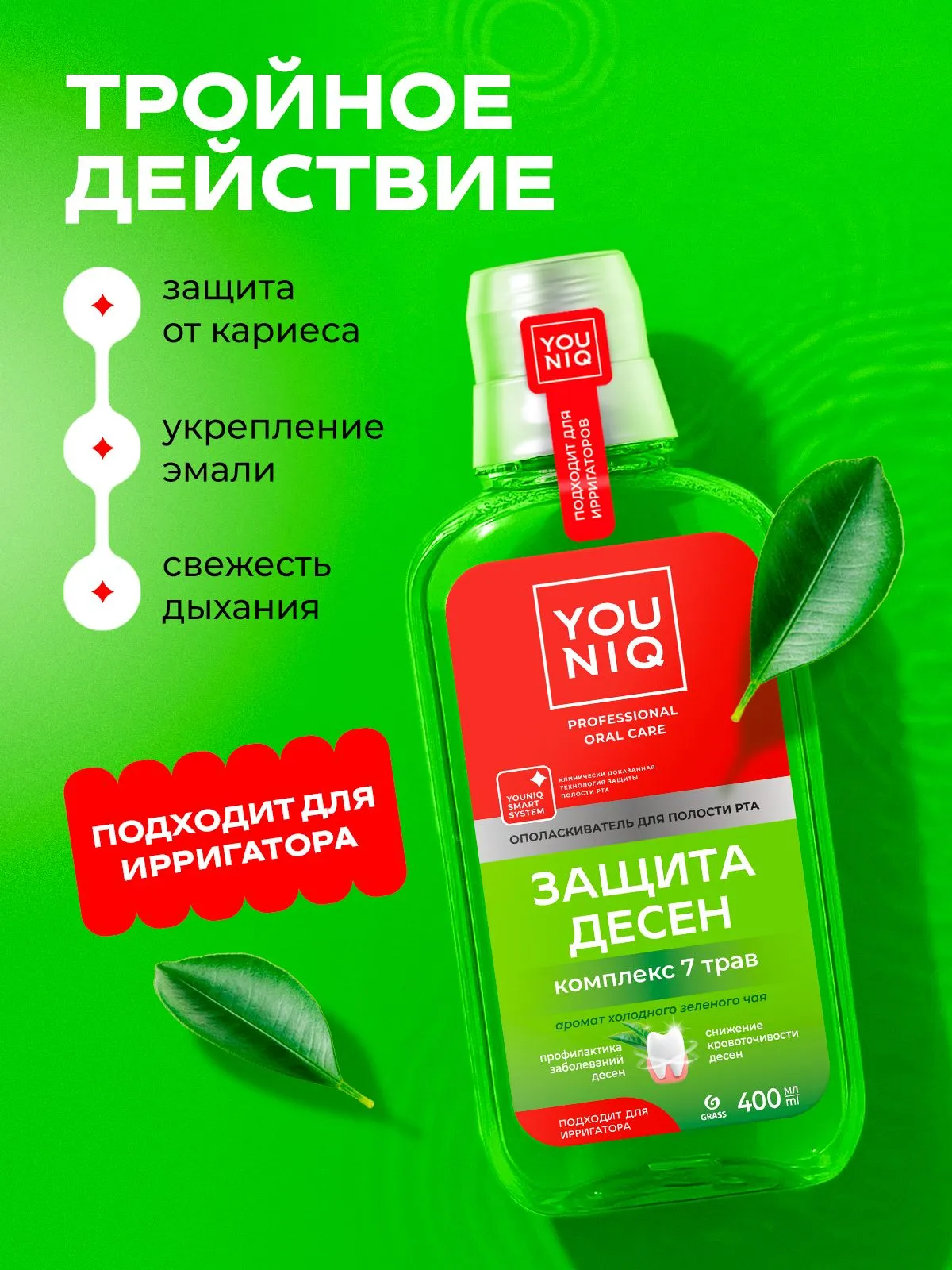 Ополаскиватель «Защита десен» создан для эффективного и комплексного ухода за вашей ротовой полостью, особенно направленный на поддержку здоровья десен. Натуральные экстракты и эфирные масла в составе, помогают предотвратить воспалительные процессы и укрепить десна, обеспечивая тем самым комфорт и защиту. Использование ополаскивателя «Защита десен» в рамках вашего ежедневного ухода поможет поддерживать здоровье десен и обеспечить надежную защиту от заболеваний полости рта. Для достижения наилучших результатов рекомендуется использовать его в сочетании с зубной пастой YOUNIQ “Защита десен”.