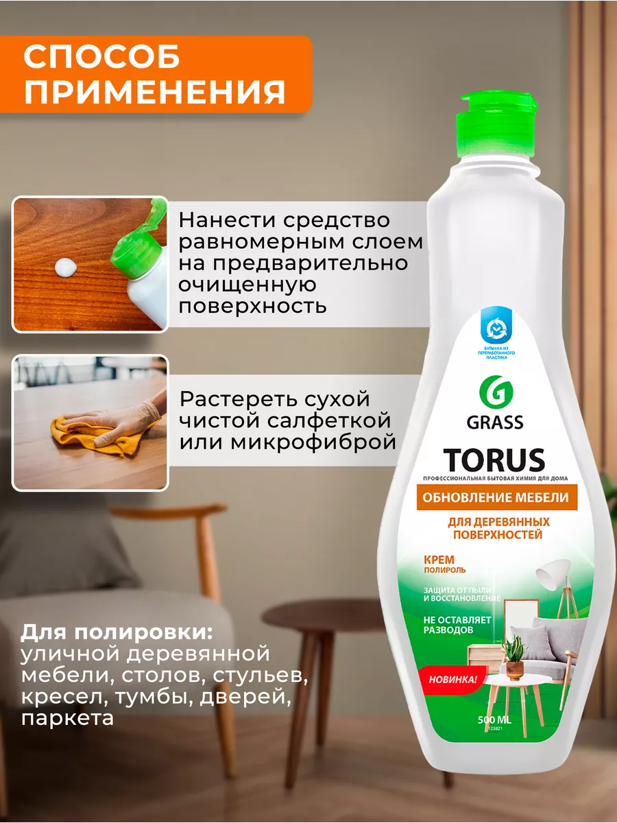 Средство Torus Cream предназначен для защиты, восстановления и сохранения естественного вида деревянных поверхностей. Придает блеск, скрывает легкие повреждения, восстанавливает красоту, не оставляет разводов и пятен после применения, обладает антистатическим эффектом.