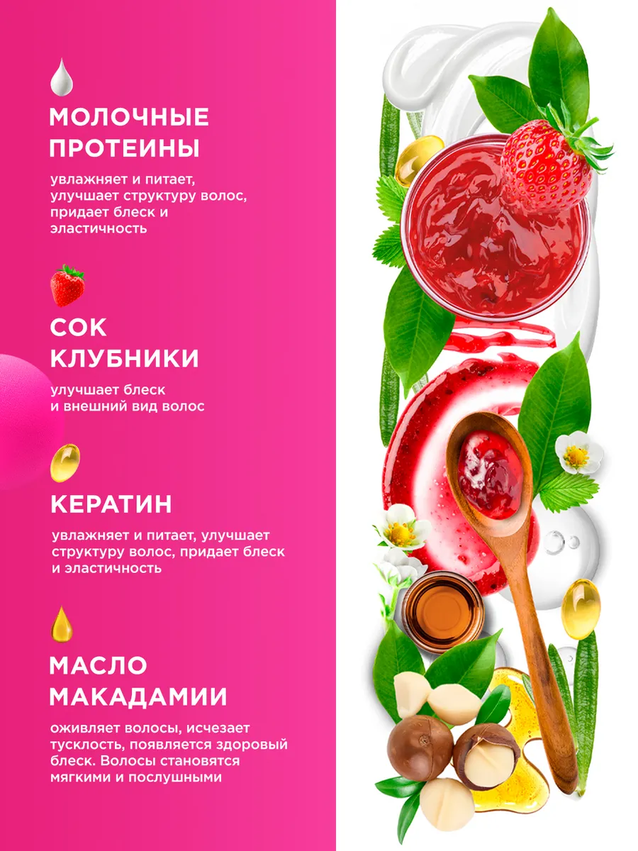 Aqua, Sodium Laureth Sulfate, Cocamidopropyl Betaine, Cocamide DEA, PEG-7 Glyceril Cocoat, Polyquaternium-7, Sodium Chloride, Fragrance, salt EDTA, Citric Acid, Phenoxyethanol, Hydrolyzed keratin, Fragaria vesca (strawberry) fruit extract, Hydrolyzed milk protein, dye