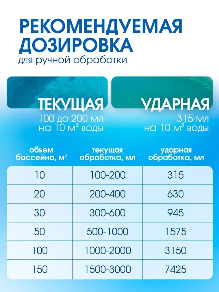 Средство добавляется после очистки воды при помощи дезинфицирующего средства и альгицида. Перед применением следует проверить показатели воды, и при необходимости довести до нормы значения рН 7.2-7.4, свободного хлора 0.3-0.5 мг/л. Внимание: не добавлять препарат напрямую в воду бассейна. При регулярной обработке вводить от 100 до 200 мл средства на 10 м3 воды, используя технический перерыв в работе бассейна. Рекомендуется использовать CRYSPOOL Коагулянт для очистки, устранения помутнения и поддержания прозрачности воды бассейна не реже 1 раза в неделю