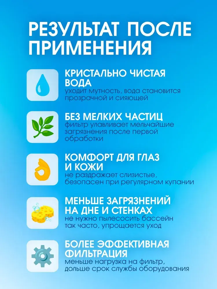 Средство предназначено для коагуляции, очистки, устранения помутнения и поддержания прозрачности воды ручным или автоматическим способом, в плавательных бассейнах спортивно-оздоровительного назначения, в том числе открытых, бассейнах при школьных, дошкольных и оздоровительных учреждениях, воды в фонтанах, бассейнах аквапарков, банных комплексах и саун, для подготовки и очистки воды в хозяйственно-питьевом и промышленном водоснабжении, для очистки сточных вод в промышленном и сельском хозяйстве.