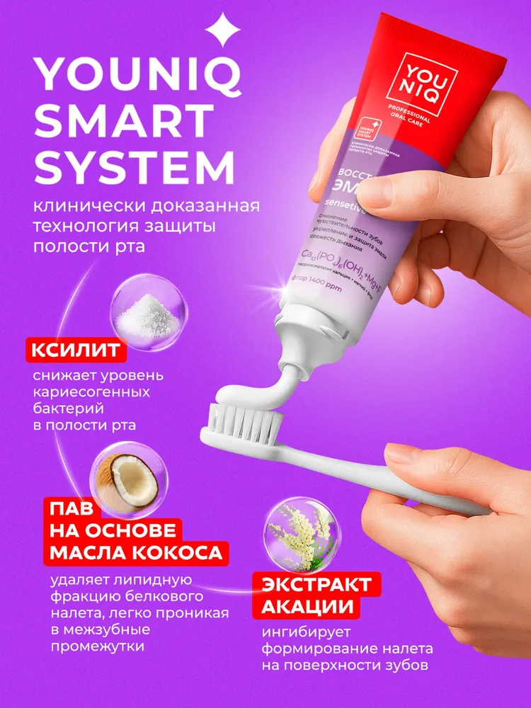 Зубная паста YOUNIQ «Для чувствительных зубов» является специализированным продуктом, разработанным для людей с повышенной чувствительностью зубов. Ее основные активные ингредиенты - это 10% суспензия гидроксиапатита кальция, магний и фтор (1400ppm). Эффективно заполняет микротрещины в эмали и способствует реминерализации, что помогает уменьшить чувствительность зубов. Гидроксиапатит кальция создает защитный барьер, предотвращая воздействие холодной, горячей или кислой пищи, что особенно важно для людей, страдающих от повышенной чувствительности.