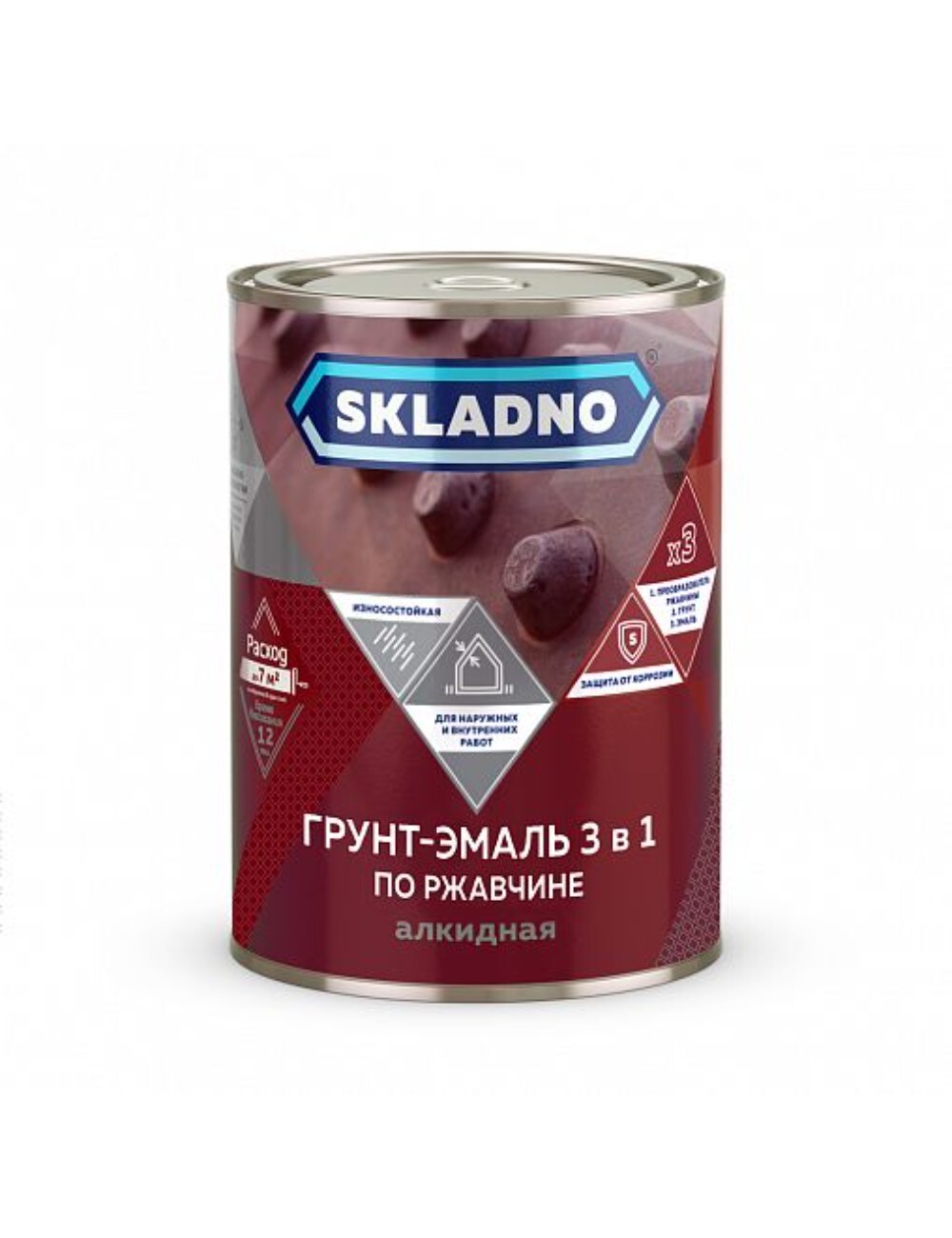Грунт-эмаль по ржавчине Skladno 3 в 1 подходит для окрашивания чистых и ржавых металлических поверхностей. Уникальный продукт, сочетающий в себе свойства 3-х компонентов: преобразователя ржавчины, антикоррозионного грунта и декоративной эмали.