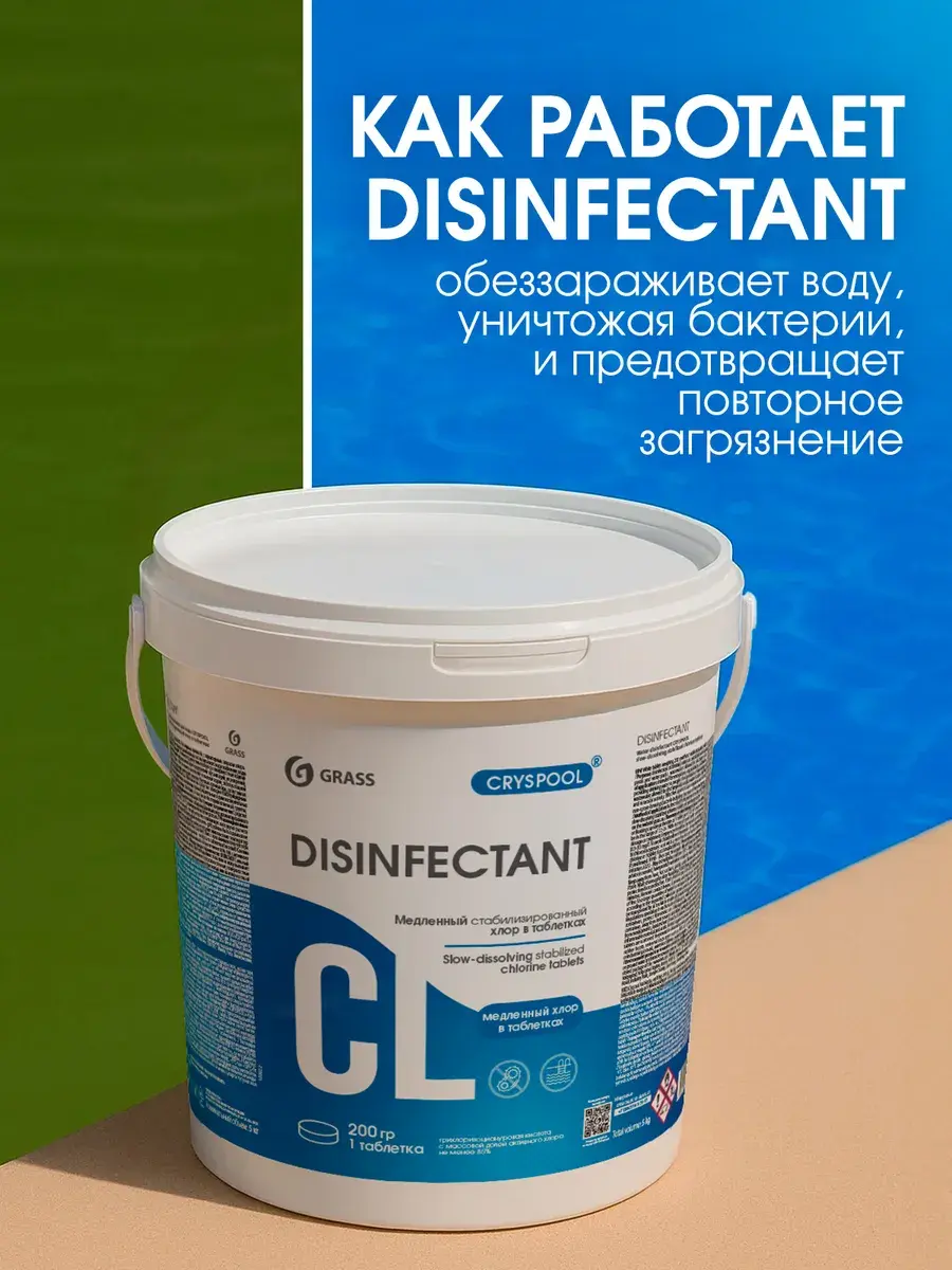 Таблетки белого цвета массой 200гр без видимых примесей, с характерным запахом хлора, средство предназначено для обеззараживания воды плавательных бассейнов и аквапарков. Обладает бактерицидной и вирулицидной активностью. Эффективно в отношение грамотрицательных и грамположительных спорообразующих и не спорообразующих бактерий.