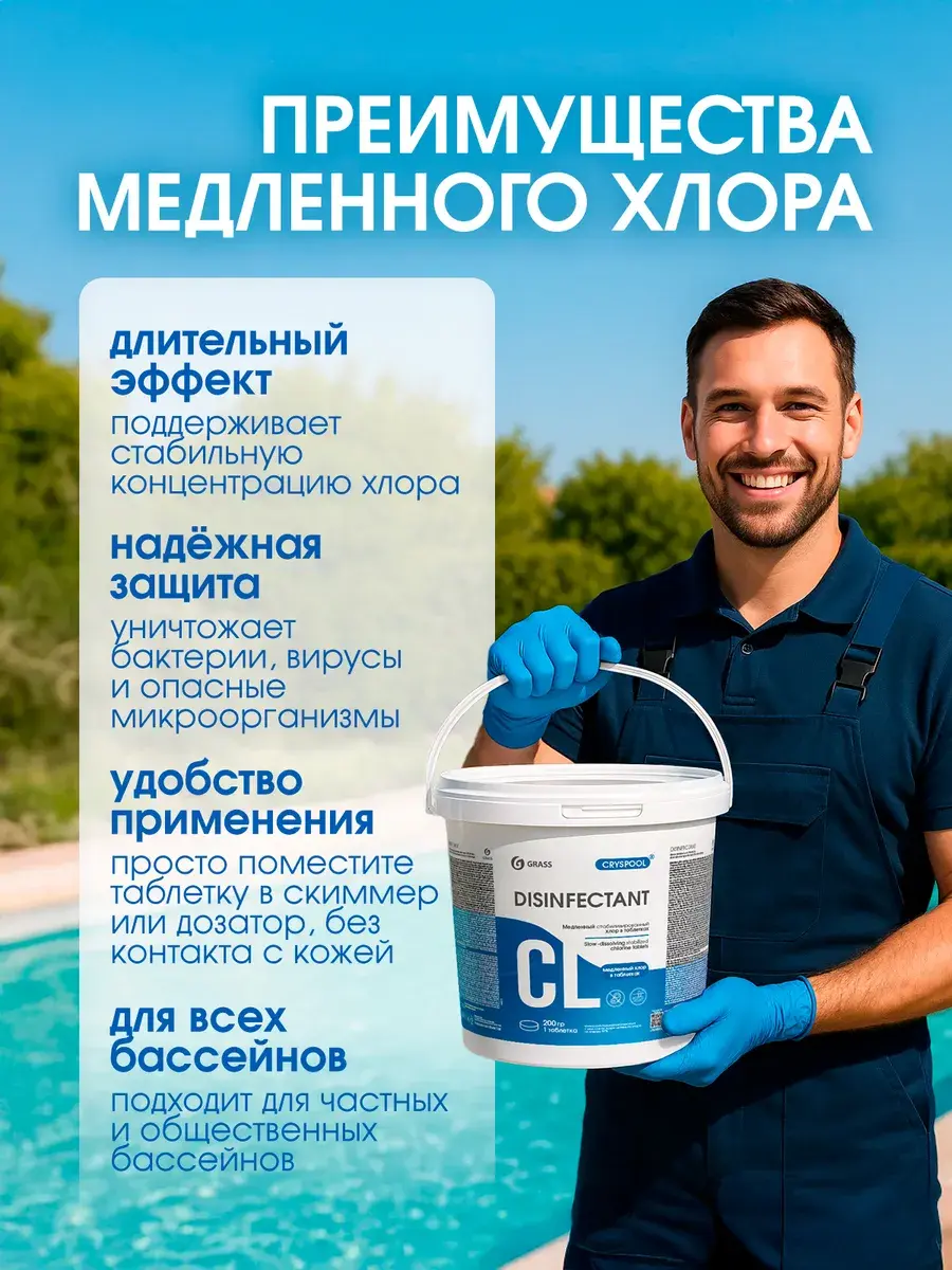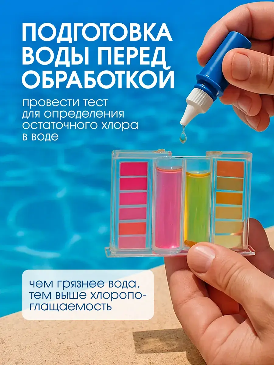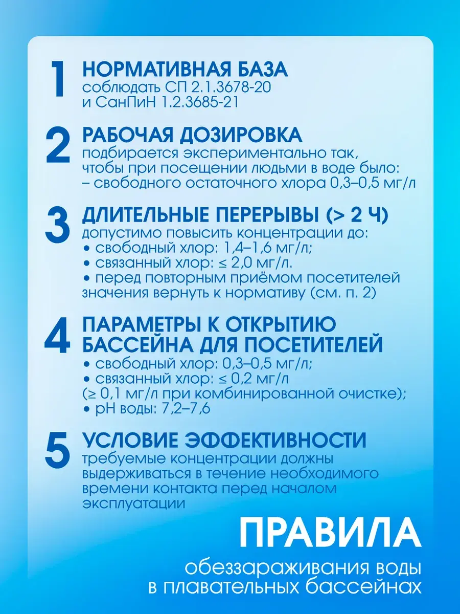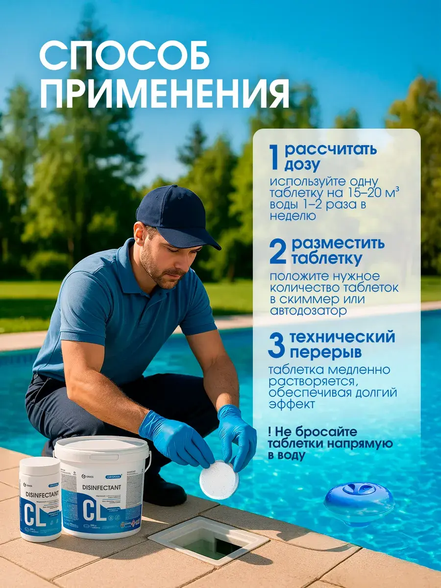 в соответствии с Инструкцией, разработанной ФБУН НИИ Дезинфектологии Роспотребнадзора №003/21 от 08.12.2021г, размещенной на сайте grass.su. Использовать строго по назначению Поместить таблетку в скиммер, автодазатор или плавающую капсулу из расчета 1 таблетка на 15-20м3 один раз в неделю. Водородный показатель (pH) должен быть в диапазоне 7,2-7,6. При увеличенном трафике посещении бассейна и воздействию высоких температур следует увеличить дозировку или частоту обработки в соответствие с показаниями хлор-тестера (0,3-0,5 мг/л). Во избежание обесцвечивания материалов – не бросать таблетки в бассейн!