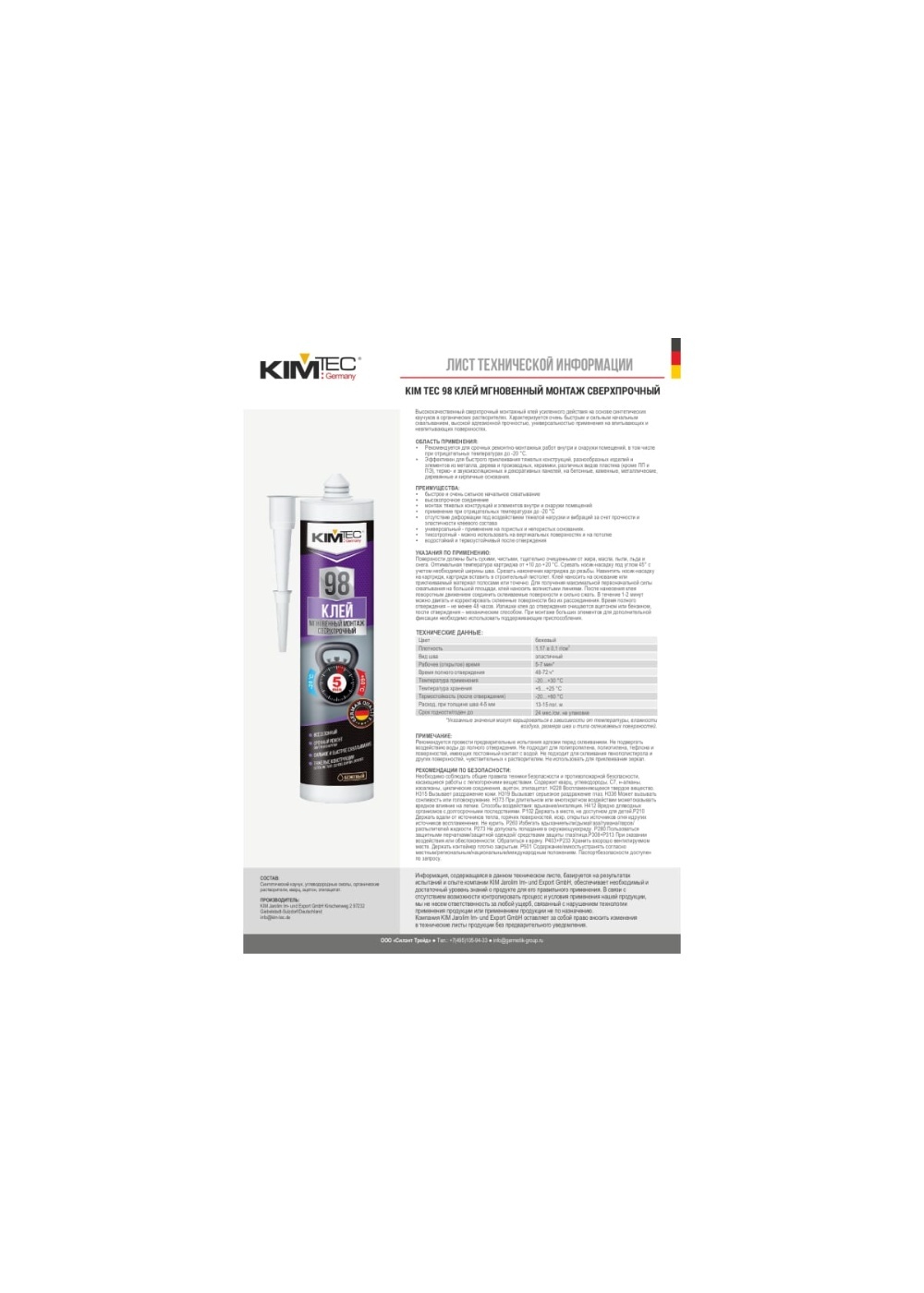 Клей жидкие гвозди KIM TEC 98 мгновенный монтаж 280 мл 11607937 - высококачественный сверхпрочный монтажный клей на основе синтетических каучуков. Очень сильное и быстрое начальное схватывание по любым поверхностям и при отрицательных температурах. Рекомендуется для выполнения срочных ремонтных работ снаружи и внутри помещений.