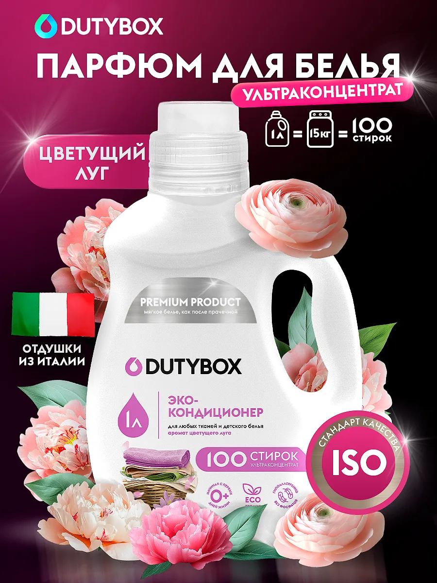 Ультра концентрированный кондиционер для белья от Дьютибокс объемом 1 литр с ярким ароматом цветущего луга. Концентрированного жидкого средства для стирки хватит до 100 применений. Ополаскиватель для стирки белья создан специально для всех типов тканей, его уникальная формула гарантирует максимальную мягкость после стирки, делая ткань нежной и приятной на ощупь, также он устраняет статическое электричество, предотвращая его возникновение во время носки. Кондиционер разработан с использованием биоразлагаемых натуральных компонентов, что делает его безопасным как для окружающей среды, так и для самой чувствительной детской кожи. Гипоаллергенный состав кондиционера дерматологически протестирован и не вызывает раздражения или аллергических реакций, подходит для стирки вещей новороженных малышей, 0+. Проникая в структуру тканей, частицы концентрата кондиционера эффективно размягчают волокна, устраняют статическое электричество и облегчают процесс глажения. Ваше белье будет выглядеть аккуратным и безупречным, а парфюмированный аромат кондиционера для белья останется на одежде на несколько дней. Ополаскиватель концентрат для стирки подходит для белого белья из различных материалов, включая хлопок, шерсть, вискозу, мембрану, а также ткани из синтетических волокон и других видов цветных и черных тканей, легко сочетается с гелем, порошком, капсулами и другими средствами для стирки, обеспечивая максимальное качество и результат.