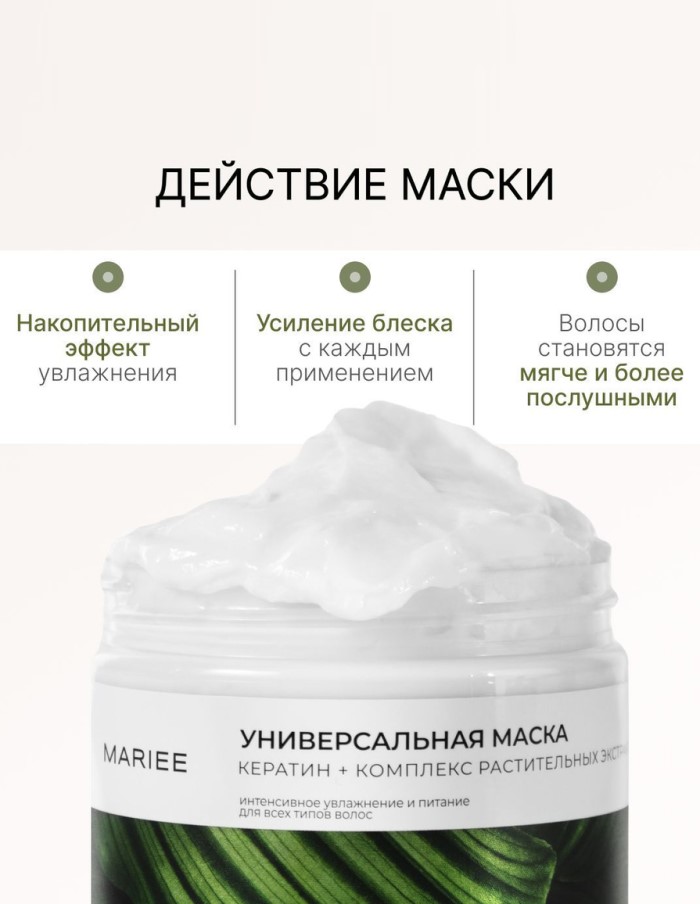 Маска для волос бренда MARIEE– это незаменимый продукт для ухода за вашими локонами. Она специально разработана для восстановления и питания волос, обеспечивая глубокое увлажнение и защиту. Профессиональная формула маски активно проникает в структуру волос, укрепляя их изнутри и восстанавливая повреждения.