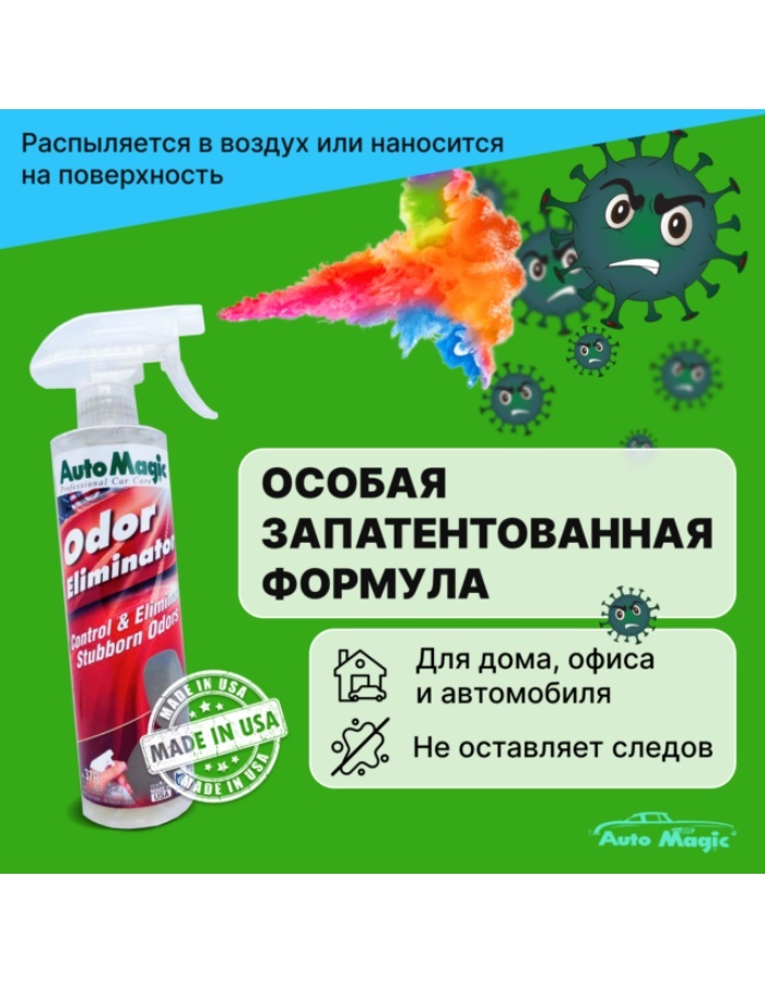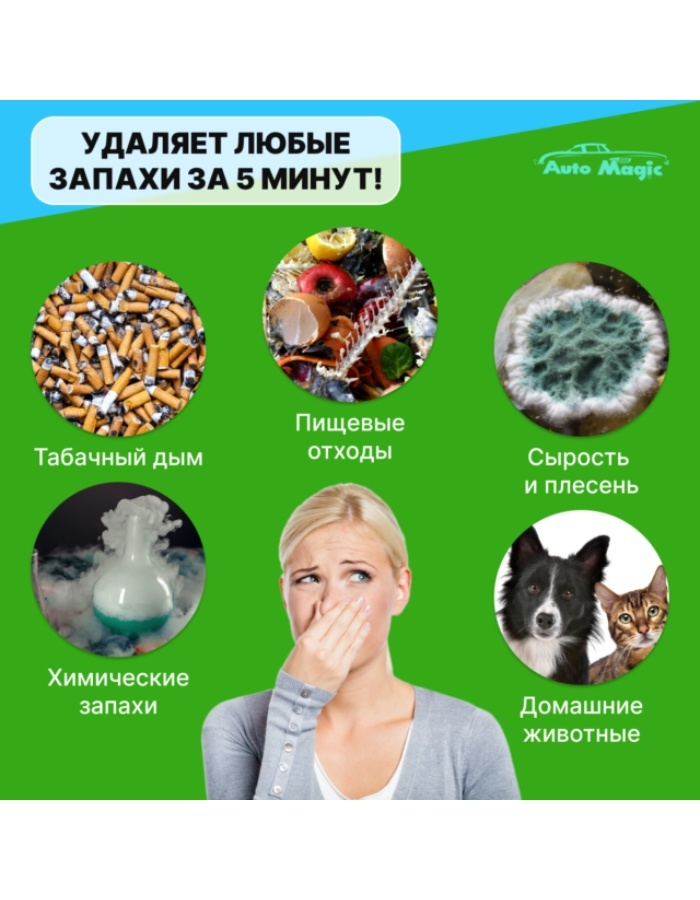 Специальный продукт для удаления стойких запахов, таких как табачный дым, запах экскрементов животных, запах пищевых продуктов и многих других с ковров и тканей в автомобилях. Продукт может быть распылен в воздухе или непосредственно на поверхность, имеет свежий и чистый аромат. Разведение: 1:40.