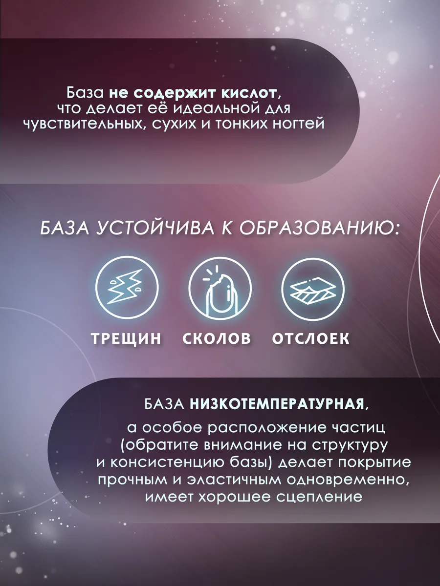 Подходит для комбинированных техник укрепления - база плюс гель/полигель. Допускается использование базы в качестве подложки, с использованием праймера. Допускается вариант с использованием подложки среднекислотной или кислотной базы, к примеру, в период перехода с кислотной на бескислотную базу.