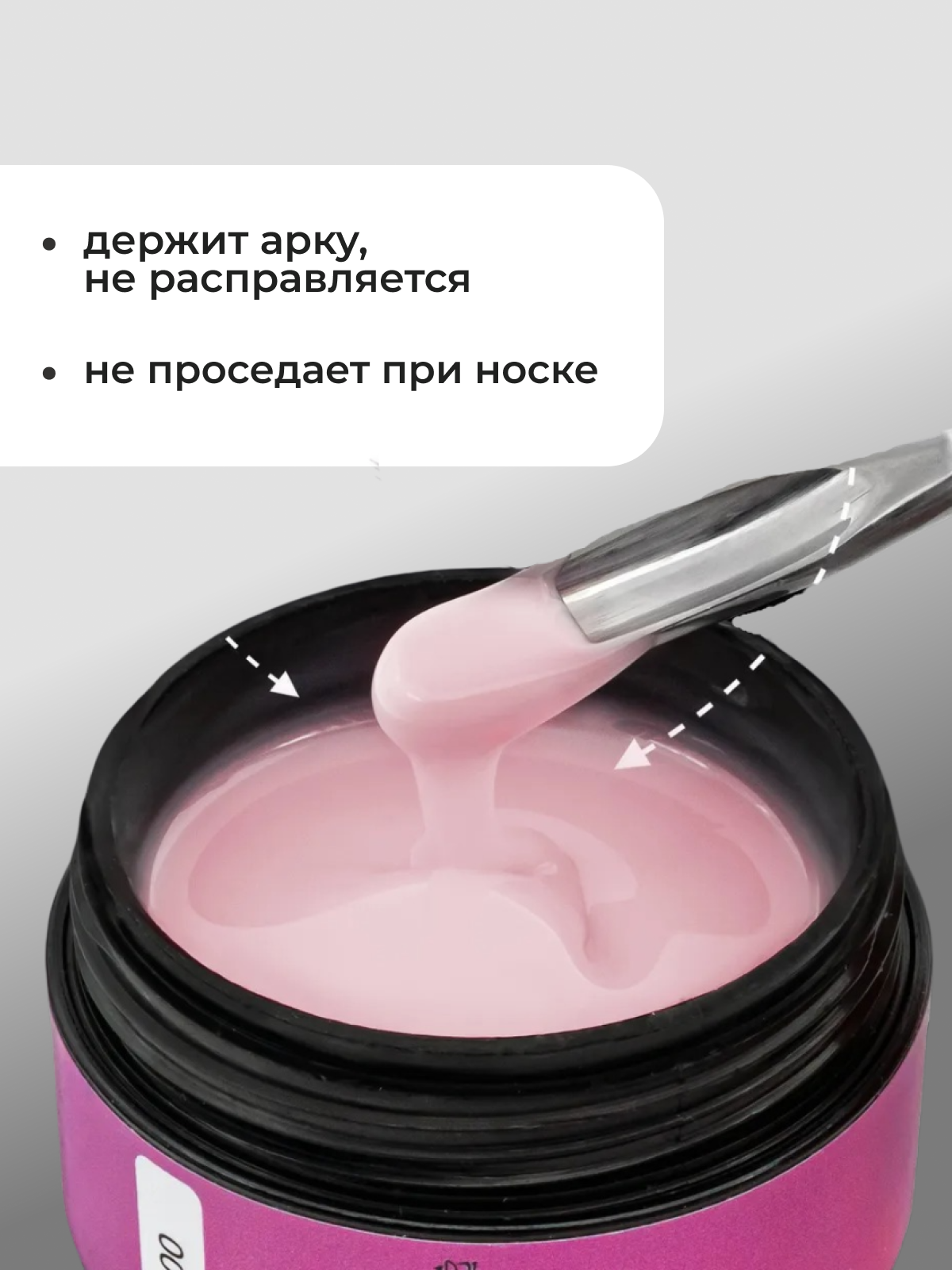 Консистенция средняя, отлично подходят для техники без опила. Поджимаются на 10-15 секунде, отлично держат арку и не расправляются в течении всей носки. Гелевое покрытие не требуют дополнительного армирования. Консистенция тиксотропная, средне густой разжижается под подвижной кистью, при распределении по ногтю. Камуфляжный гель для моделирования ногтей подойдет для наращивания на верхние формы.