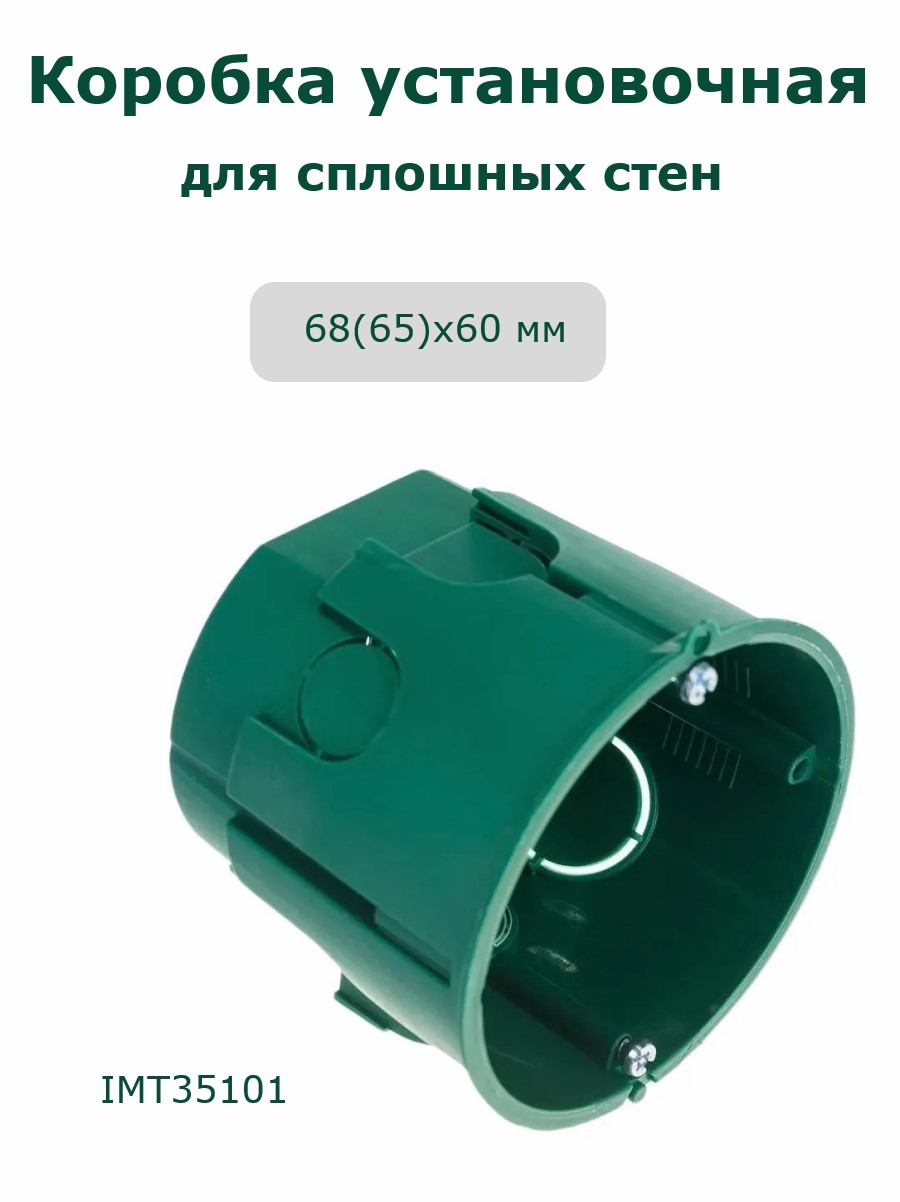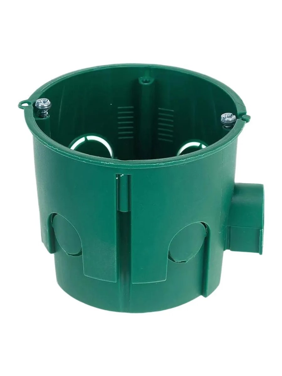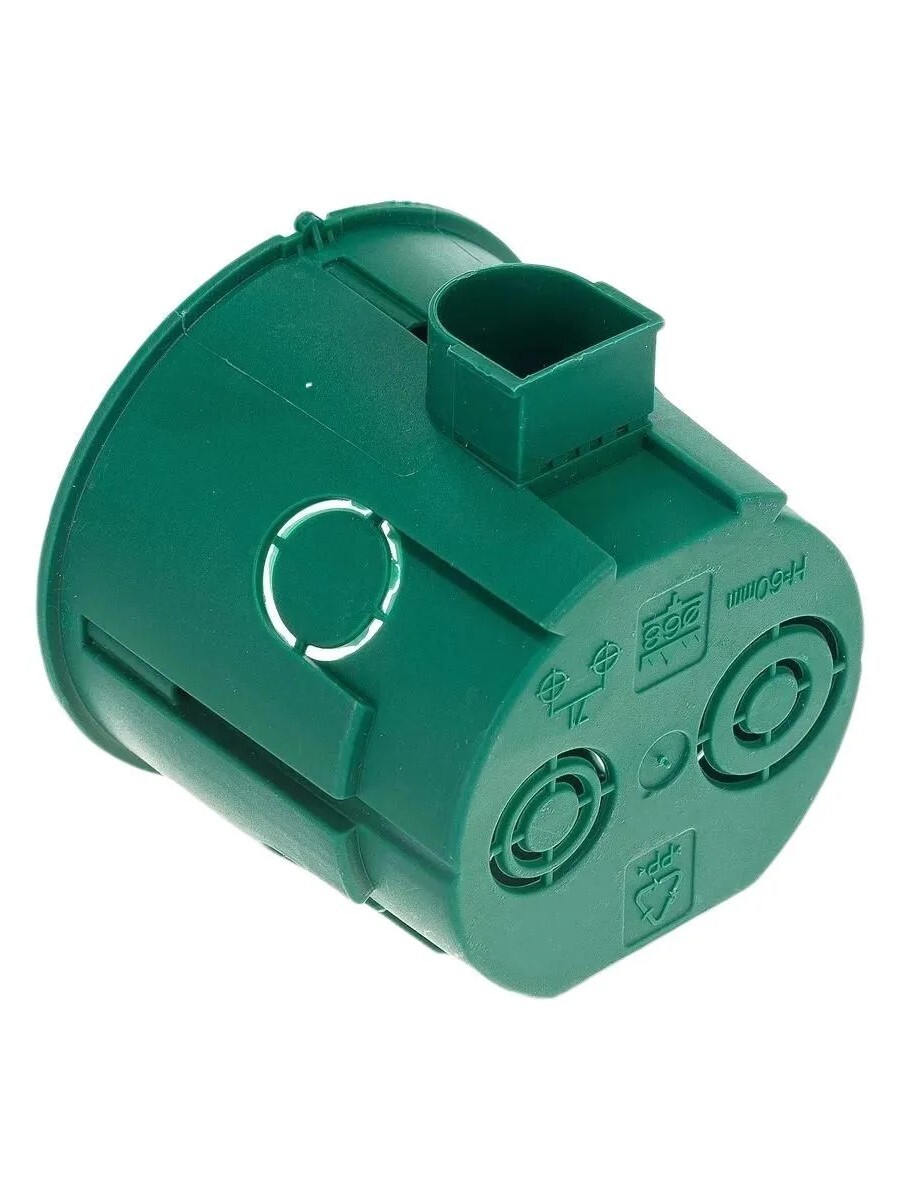 Характеристики: Тип распаечная коробка, распределительная коробка, коробка установочная для сплошных стен. Материал пластик, полипропилен. Конструкция круглая. Цвет зеленый. Глубина 60 мм. Количество вводов 8. Огнестойкость 650°C. Степень защиты 30 IP. Рабочая температура от -25 до 60 °С.