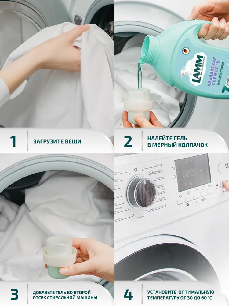 Гель для стирки LAMM "АЛЬПИЙСКАЯ СВЕЖЕСТЬ" с пониженным пенообразованием с биодобавками эффективно и бережно отстирывает белые и светлые изделия из хлопчатобумажных, льняных и синтетических тканей, а также тканей из смешанных волокон в стиральных машинах любого типа и при ручной стирке.