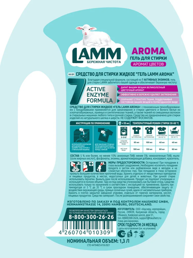Гель для стирки LAMM "AROMA" с пониженным пенообразованием с биодобавками эффективно и бережно отстирывает белые и цветные изделия из хлопчатобумажных, льняных и синтетических тканей, а также тканей из смешанных волокон в стиральных машинах любого типа и при ручной стирке.