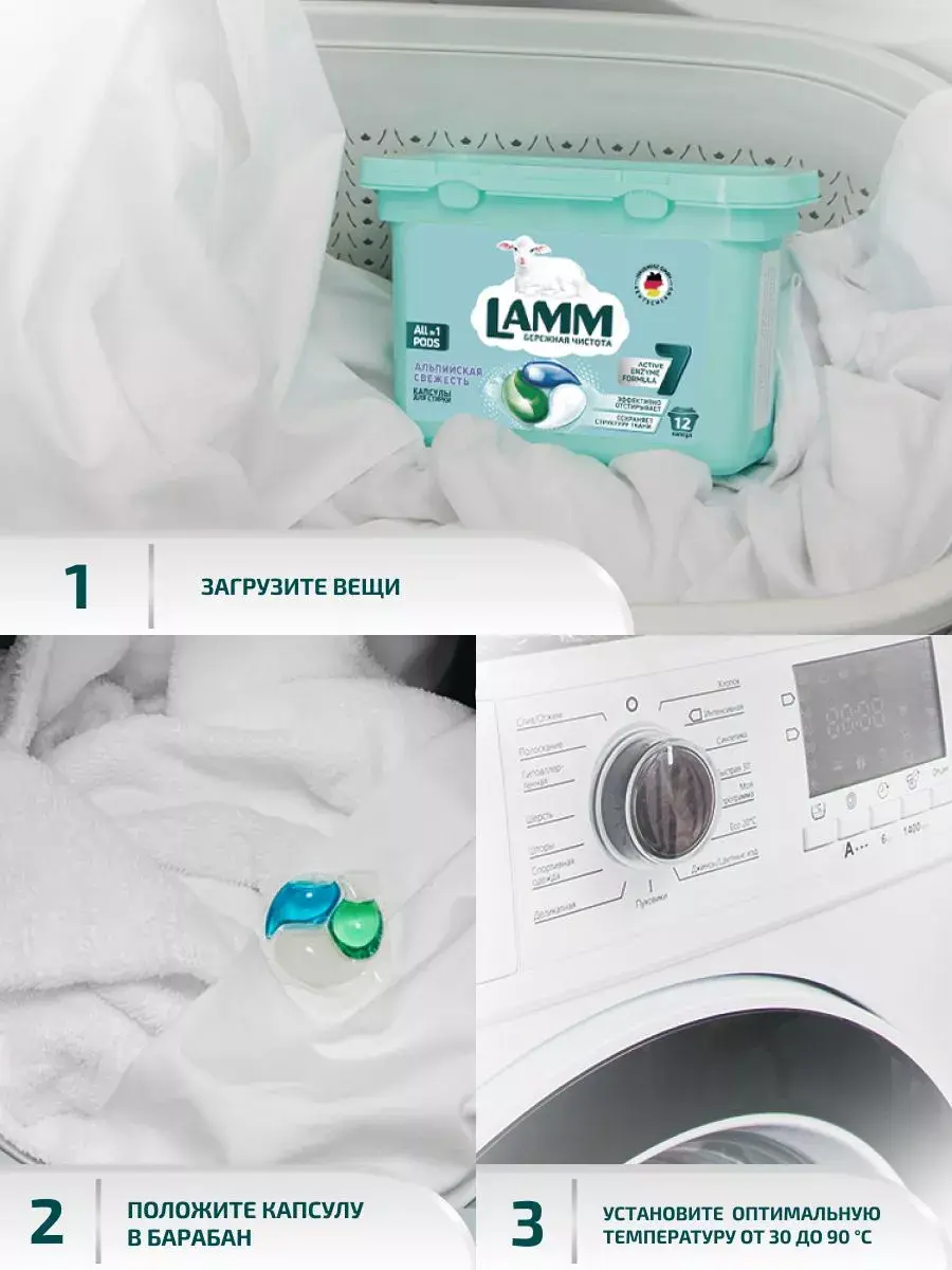 Капсулы для стирки LAMM "Альпийская свежесть" All in 1 с пониженным пенообразованием и биодобавками эффективно и бережно отстирывают белые и светлые изделия из хлопчатобумажных, льняных и синтетических тканей, а также тканей из смешанных волокон в стиральных машинах любого типа.