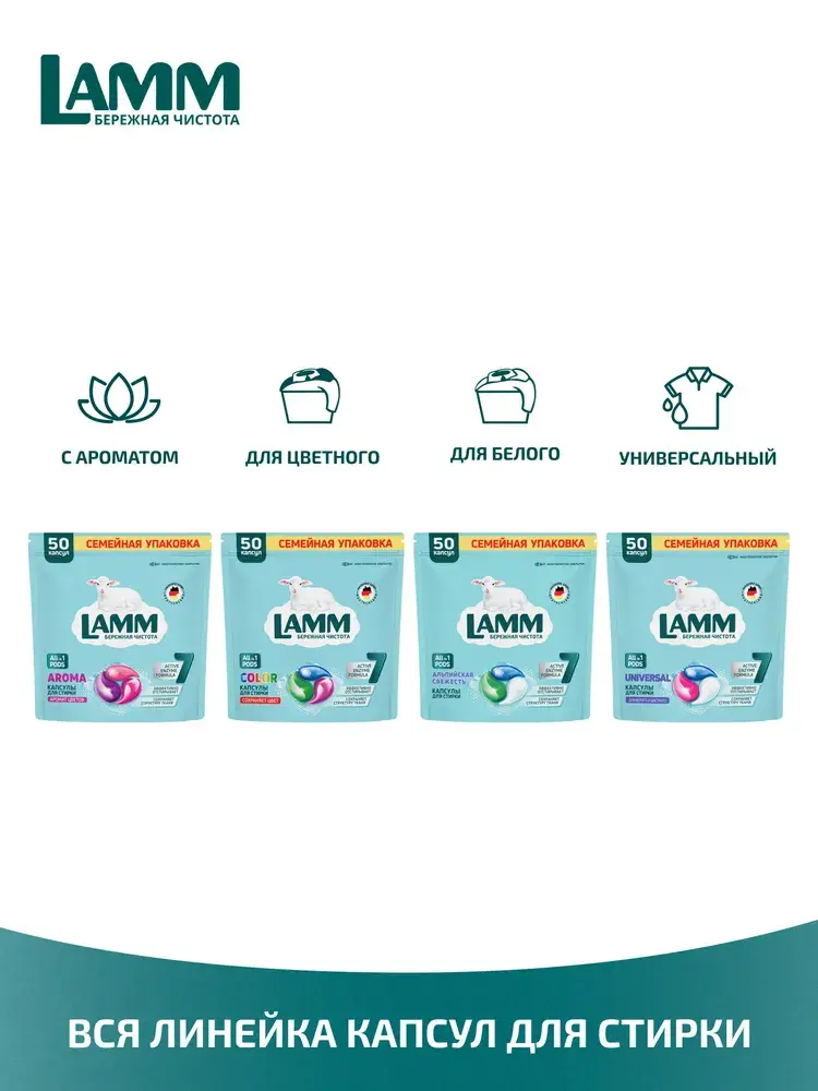 Капсулы для стирки LAMM "Альпийская свежесть" All in 1 с пониженным пенообразованием и биодобавками эффективно и бережно отстирывают белые и светлые изделия из хлопчатобумажных, льняных и синтетических тканей, а также тканей из смешанных волокон в стиральных машинах любого типа.