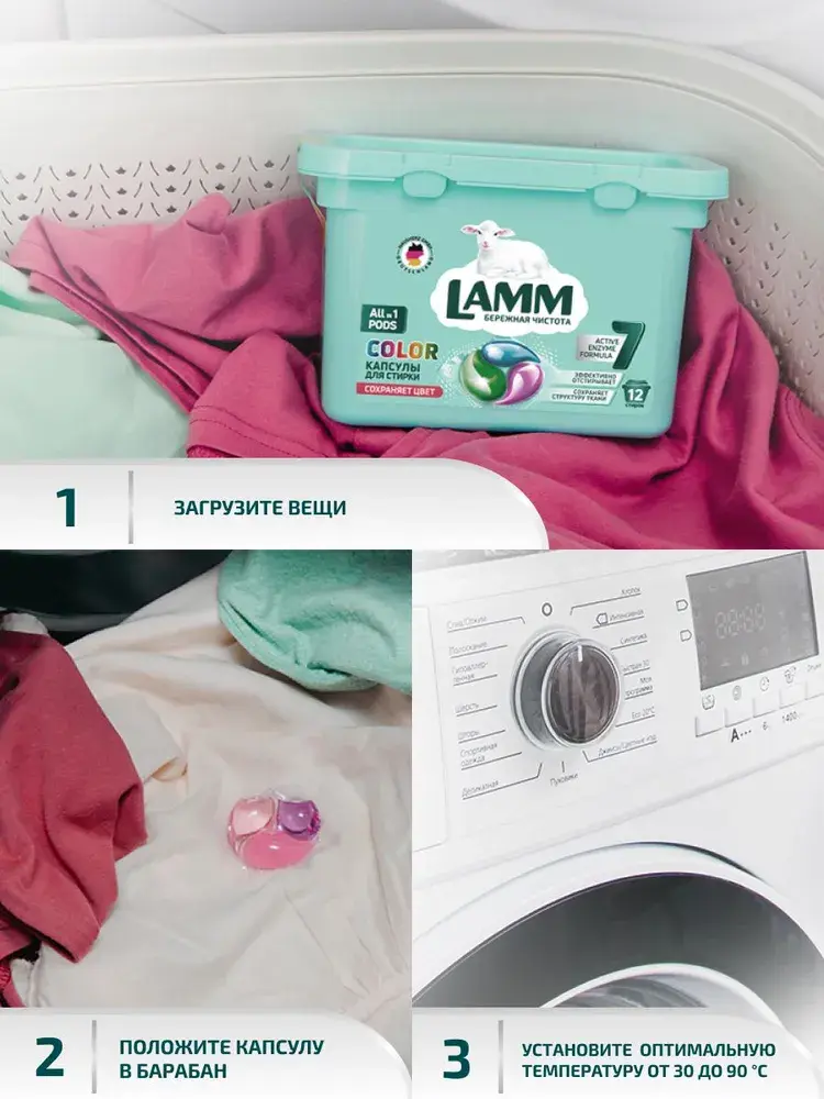 Капсулы для стирки LAMM "COLOR" All in 1 с пониженным пенообразованием и биодобавками эффективно и бережно отстирывают белые и цветные изделия из хлопчатобумажных, льняных и синтетических тканей, а также тканей из смешанных волокон в стиральных машинах любого типа.