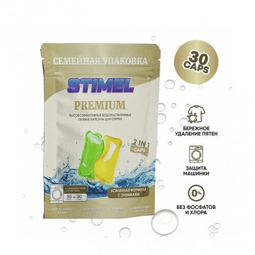 Концентрированное высокоэффективное моющее средство в водорастворимых двухкомпонентных капсулах для стирки ТМ STIMEL PREMIUM