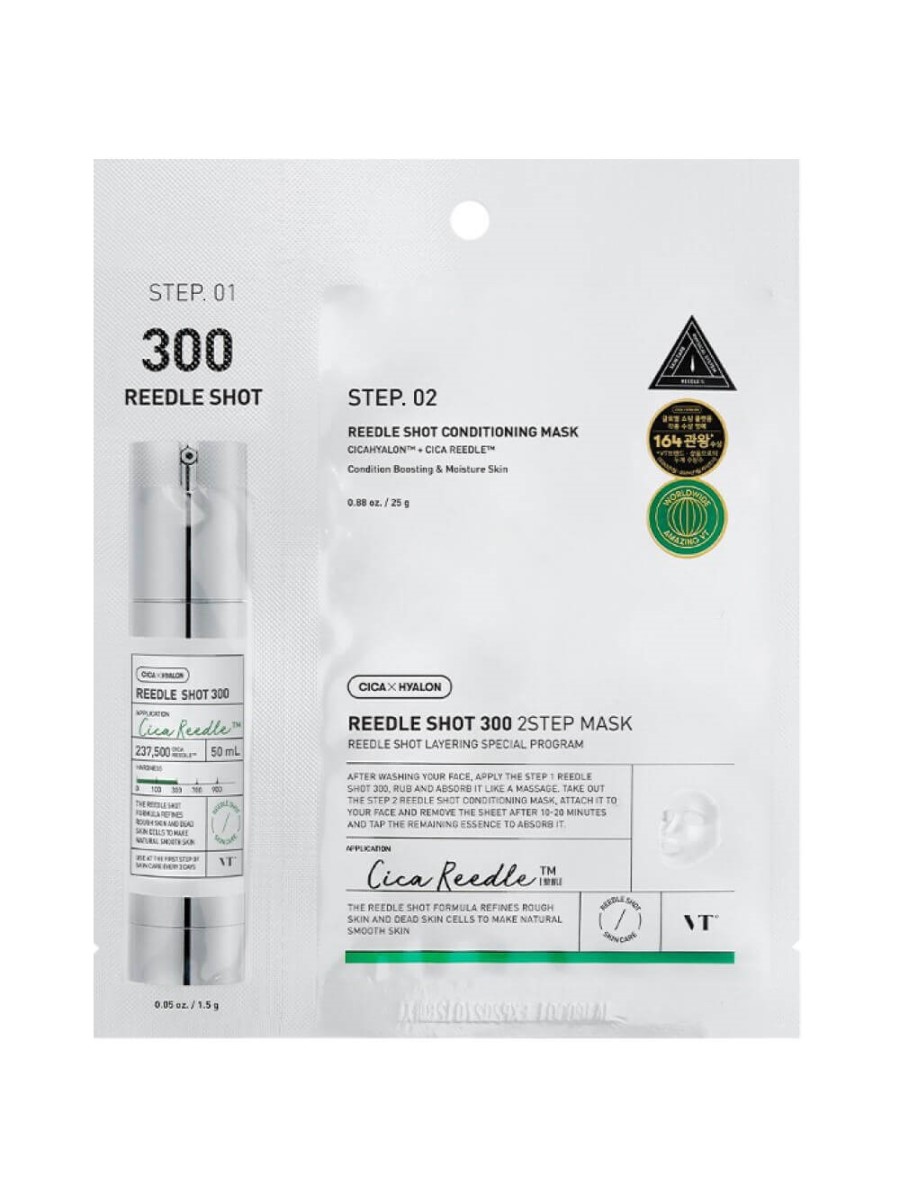 Продукт состоит из двух шагов: 1 шаг — бустер-сыворотка Reedle Shot 300 с микроиглами, активно прорабатывает различные кожные проблемы и предназначена для тех, кто ранее уже имел знакомство с этим компонентом; 2 шаг — тканевая маска для усиления эффекта сыворотки, помогает успокоить кожу, раздражённую действием микроигл.