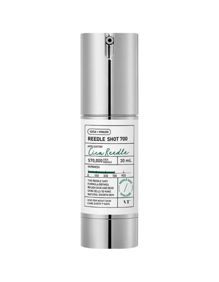 Ночная сыворотка-бустер с микроиглами VTCOSMETICReedle Shot 700 оказывает действие, по результату схожее с процедурой микронидлинга — стимулирует процессы естественного обновления эпидермиса благодаря отшелушиванию и восстановлению рогового слоя. Средство ускоряет кровообращение и клеточный обмен, уменьшает отёчность и птоз тканей, сокращает морщины и заломы, подтягивает овал лица. Выравнивает тон и текстуру кожи, при регулярном использовании помогает добиться glass skin-эффекта. Содержит экстракты центеллы азиатской и зелёного прополиса, ниациниамид, аминокислоты, аденозин.
